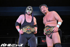 【写真】ベルトを巻いたエフェヴィガがマイクを持って感謝を述べると、長南亮TRIBE代表も目頭を押さえている――ように見え… -