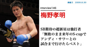 梅野 孝明は大阪府摂津市出身のキックボクサー。スーパーウェルター級で活躍するトップファイターである。